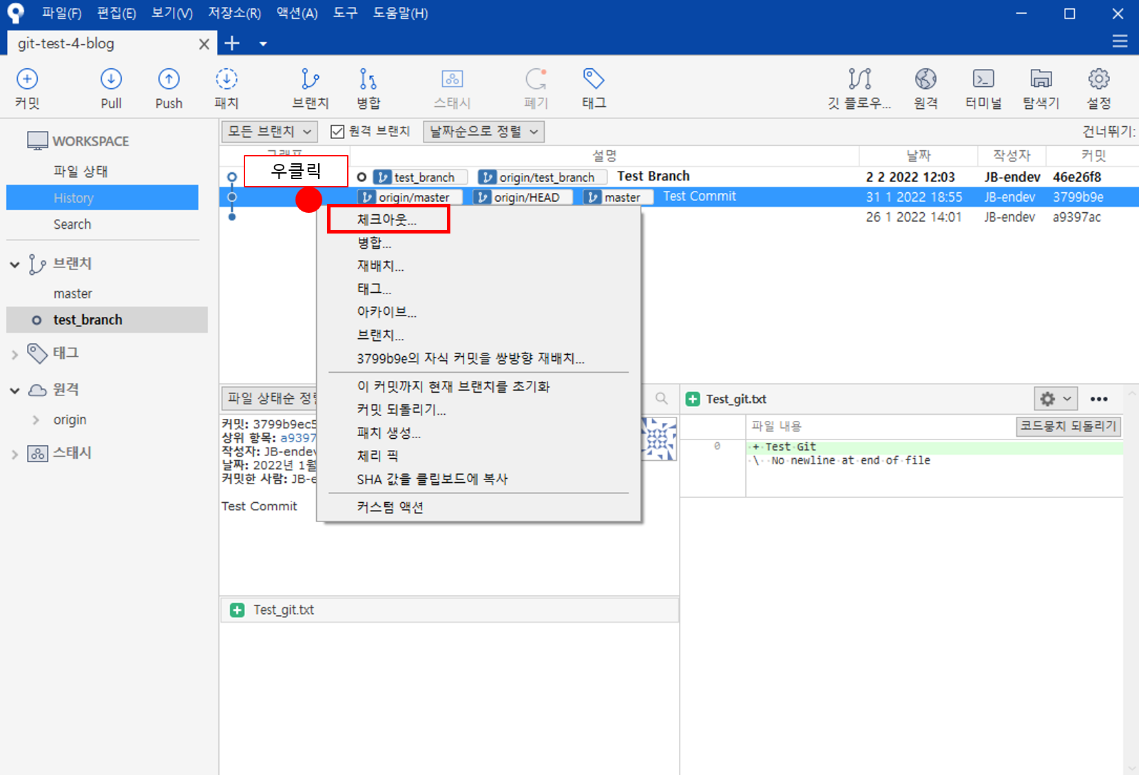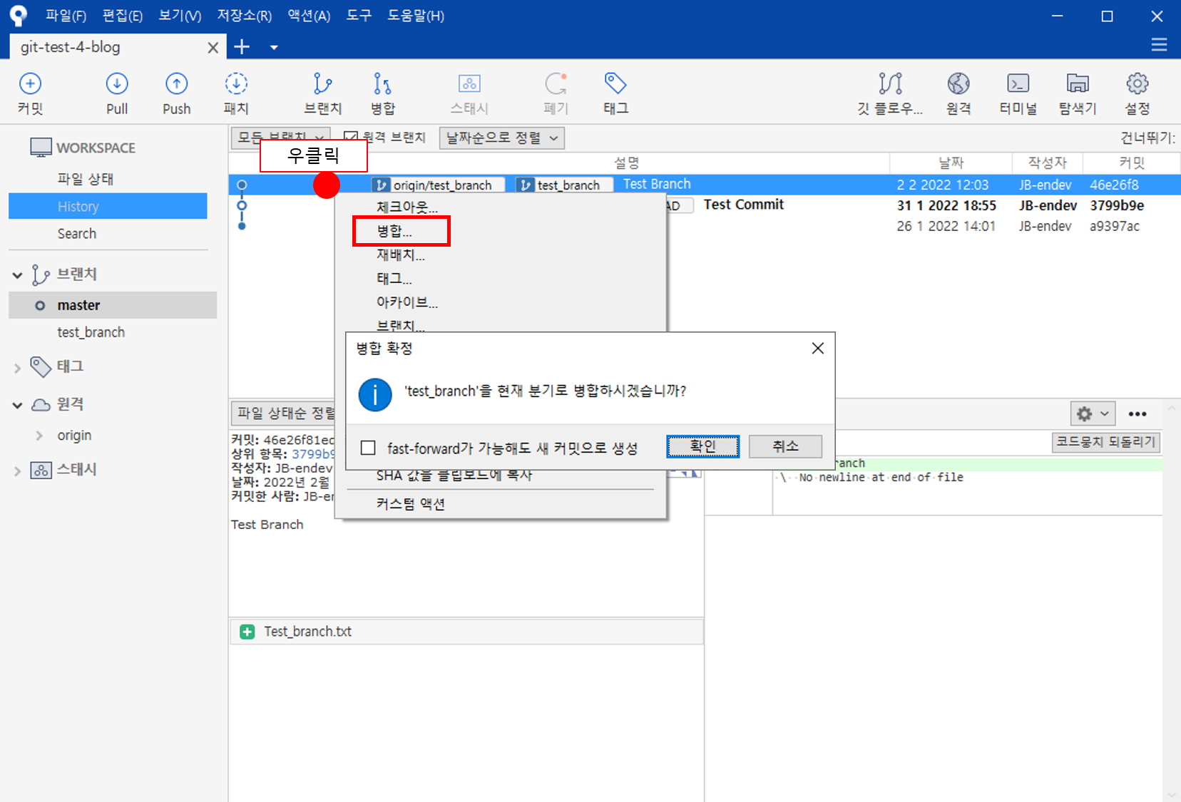 그 후 test_branch 브랜치를 우클릭해서 merge 한다.