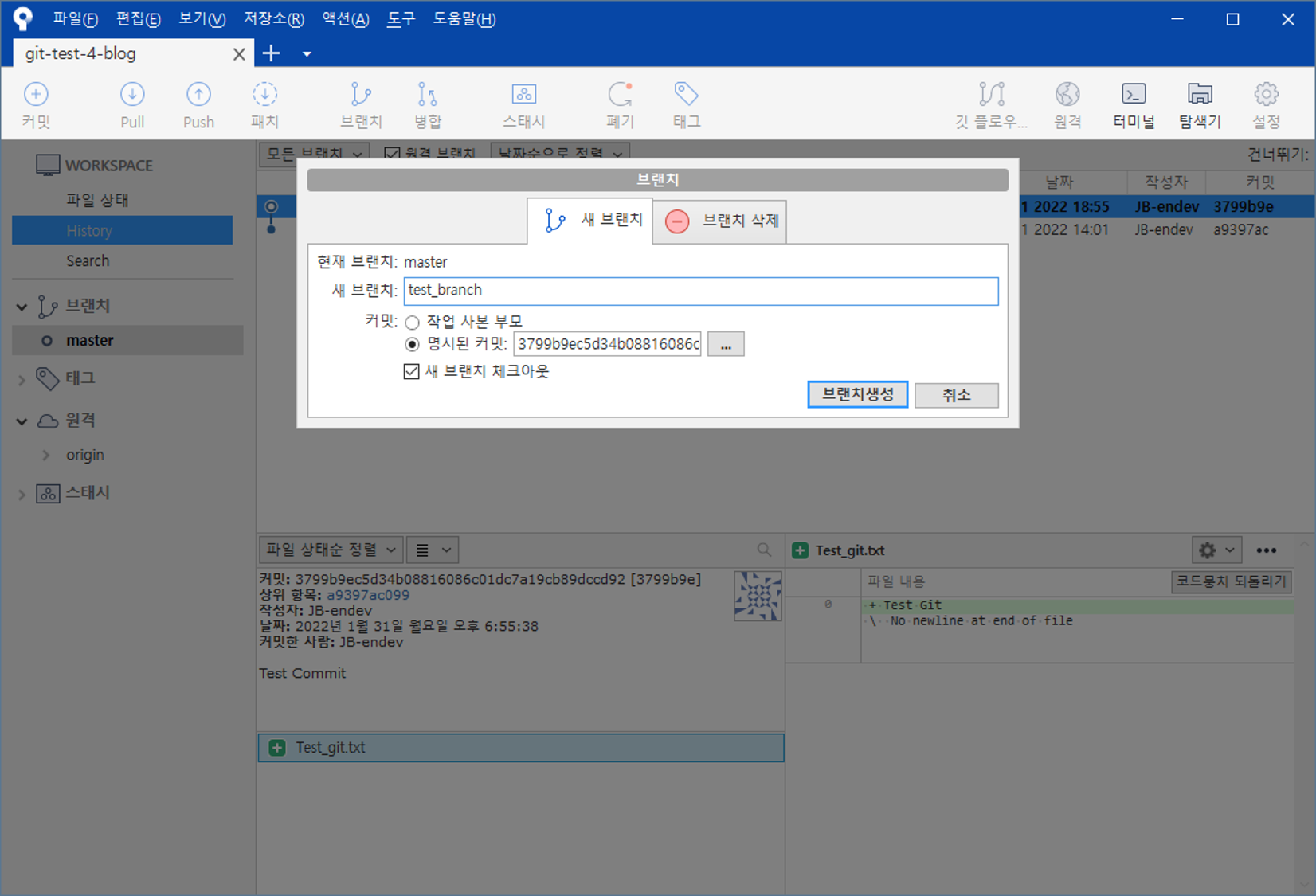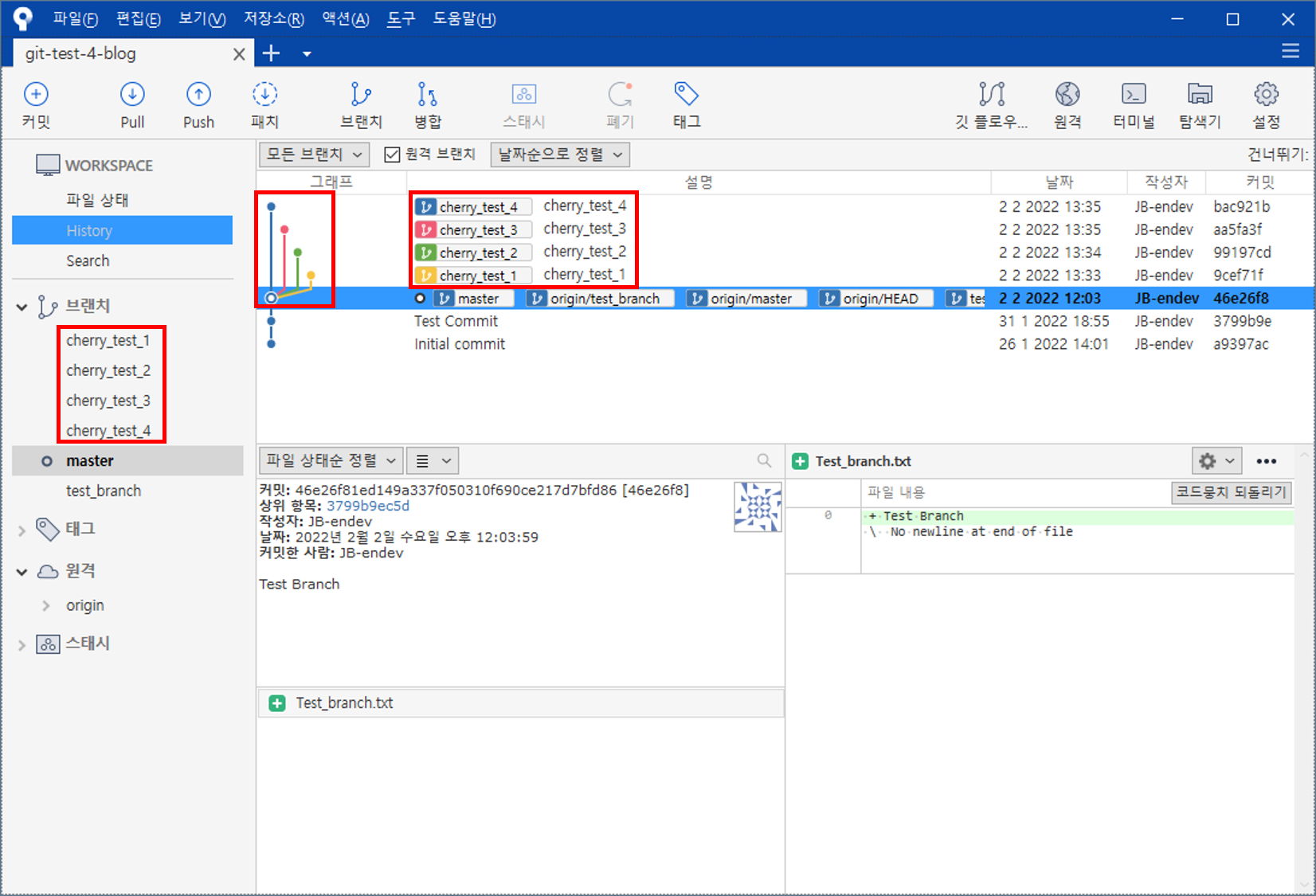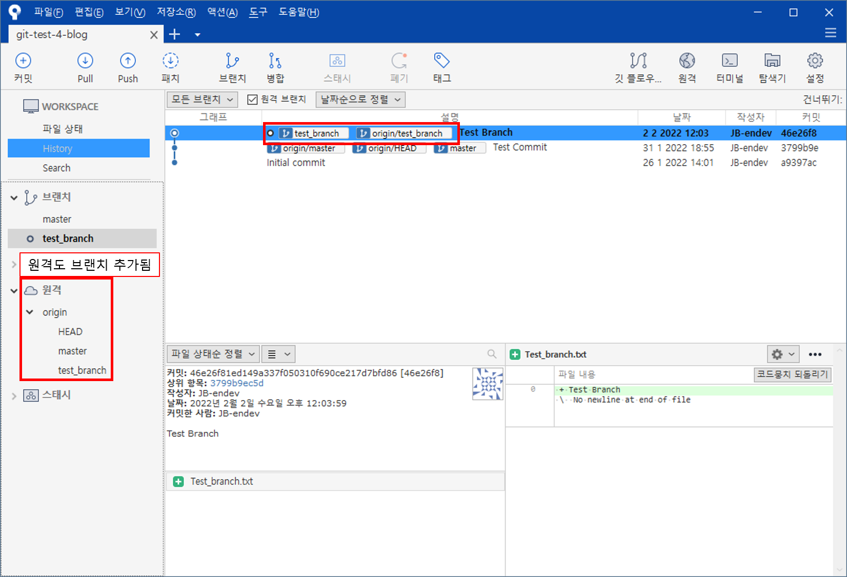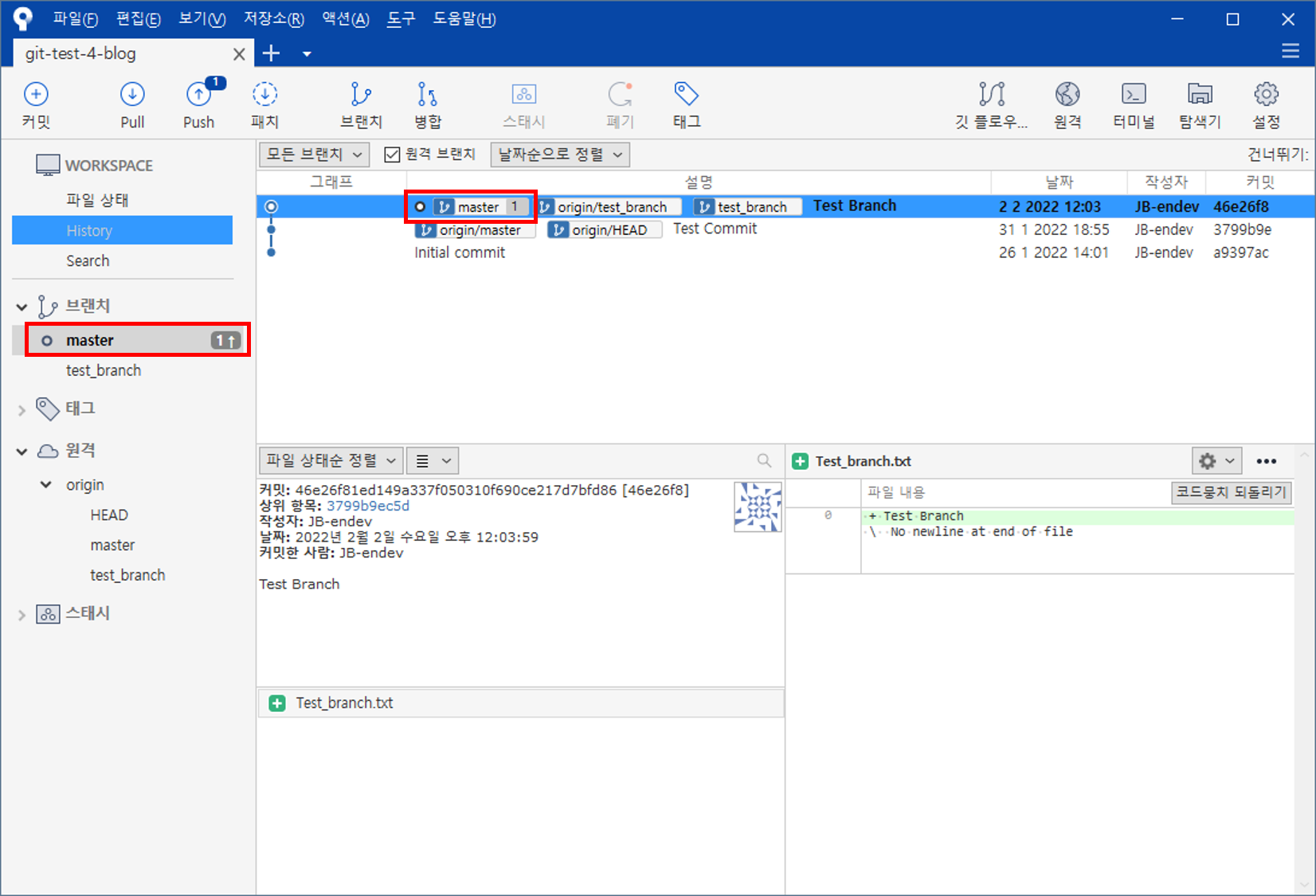 test_branch 브랜치에 있는 파일이 master 브랜치에 적용된 모습이다.