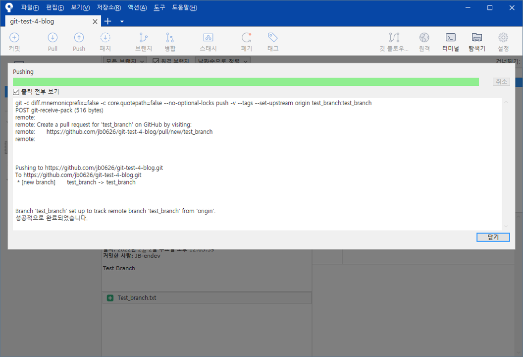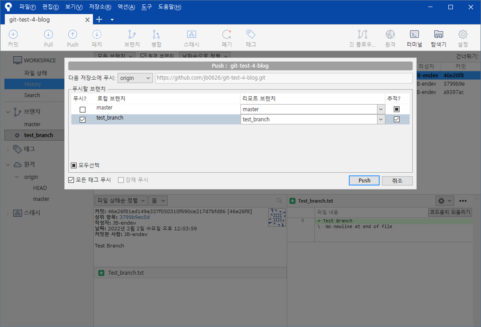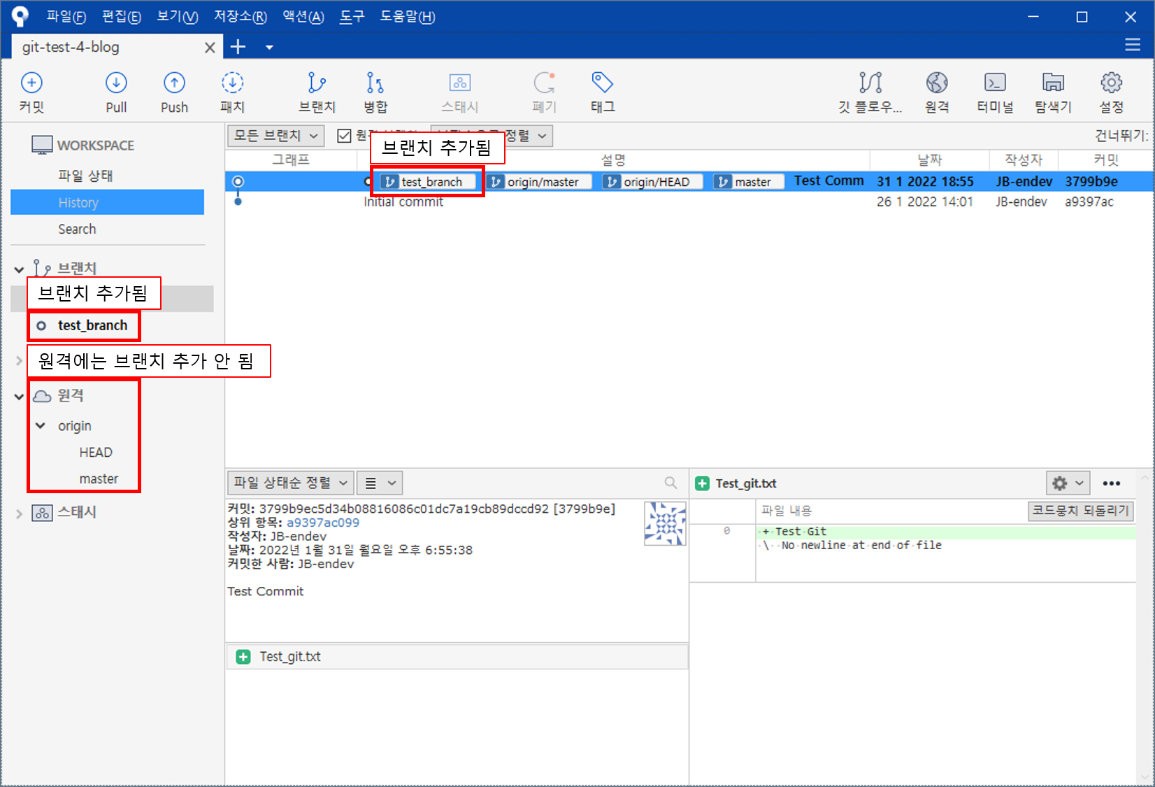 test_branch 브랜치에 있는 파일이 master 브랜치에 적용된 모습이다.