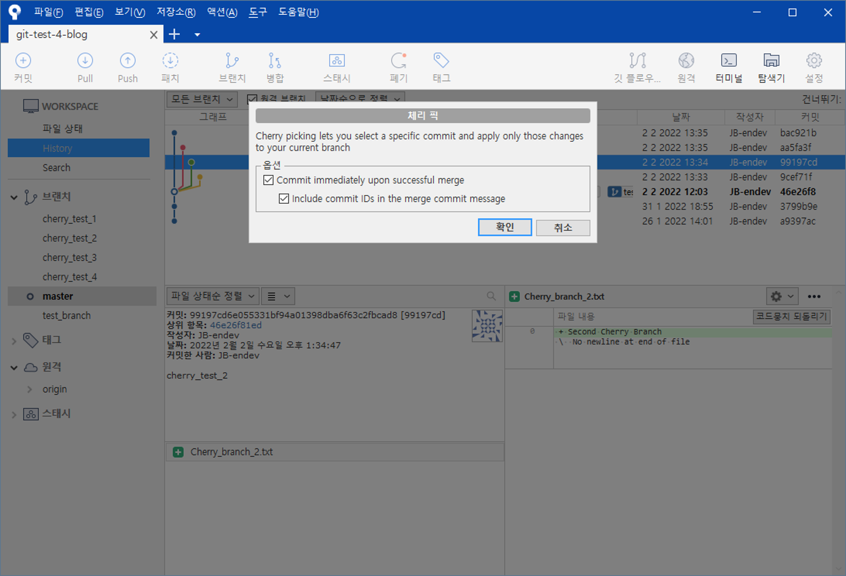 (여기서는 master 이지만, 체리 픽을 적용할 브랜치로 체크아웃 한 후 진행하면 되겠다.)