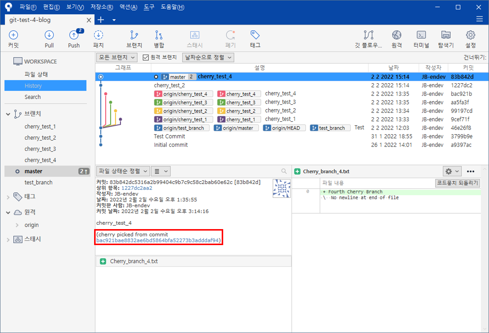 여러 개의 브랜치를 생성한 후 체리픽을 진행해보겠다.