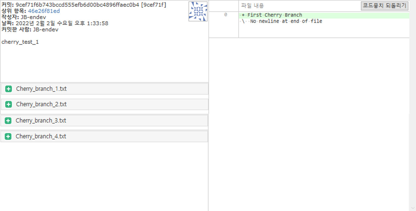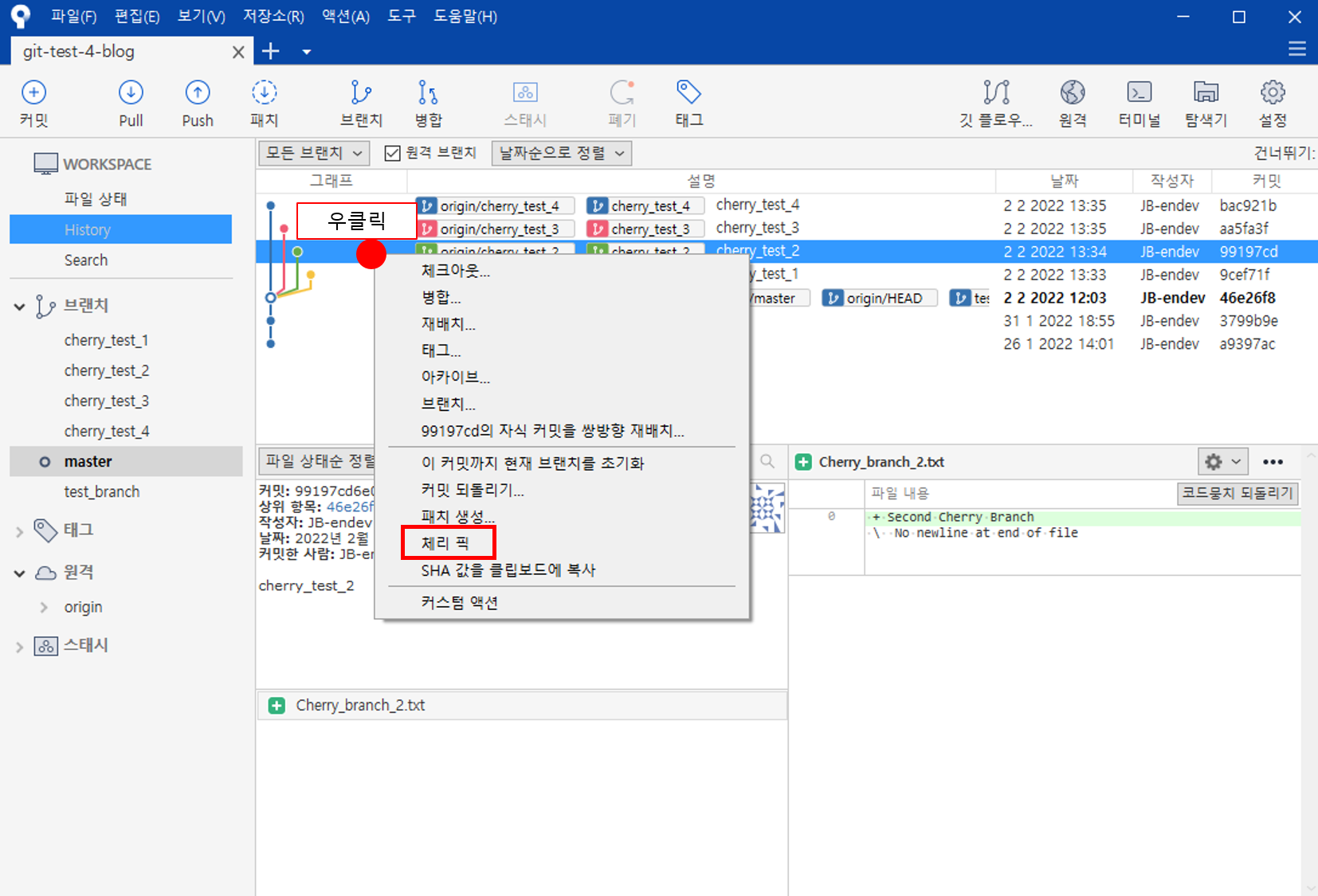 그 후 체리 픽할 브랜치를 우클릭해서 체리 픽을 진행한다.