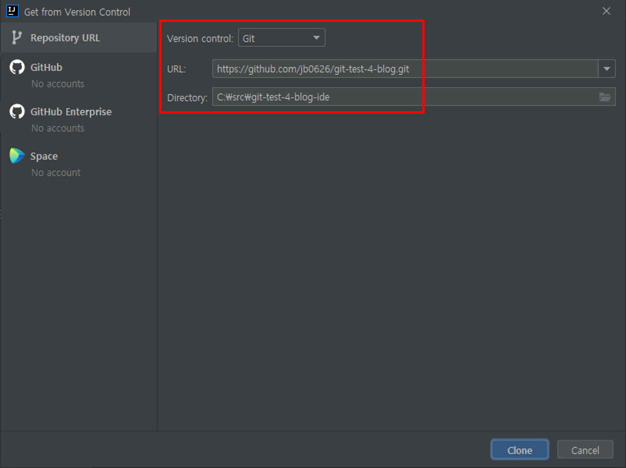Git URL 과 Local 경로를 적고 Clone 을 진행한다.