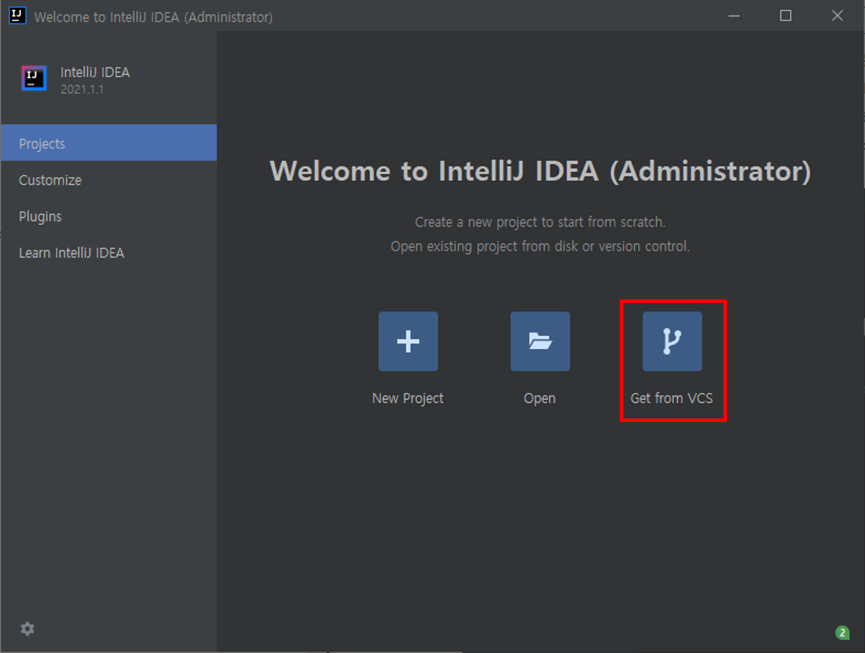 SVN 과 동일하게 Get from VCS 를 클릭한다.