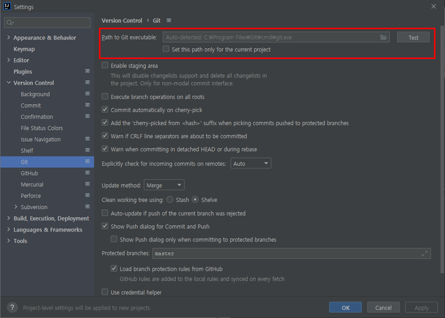 설치를 하면 Intellij 에서는 SVN 과는 다르게 자동으로 탐지해서 경로를 잡아준다.