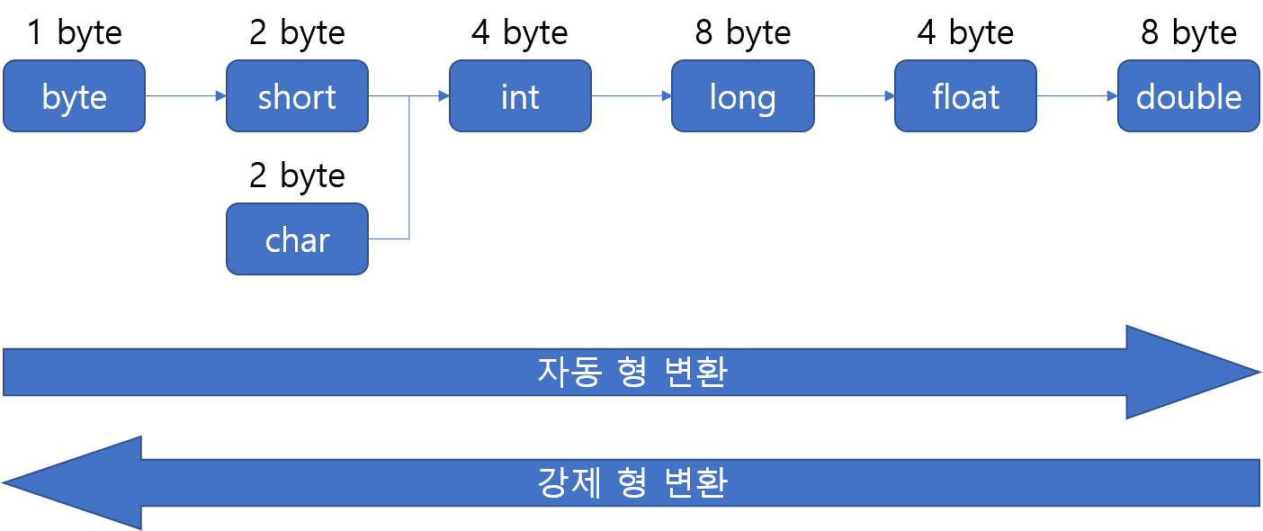 - 데이터의 손실 없이 안정적으로 형 변환이 가능한 경우에만 내부적으로 자동으로 형 변환을 수행하고, 손실 가능성이 있는 경우라면 에러가 발생한다.