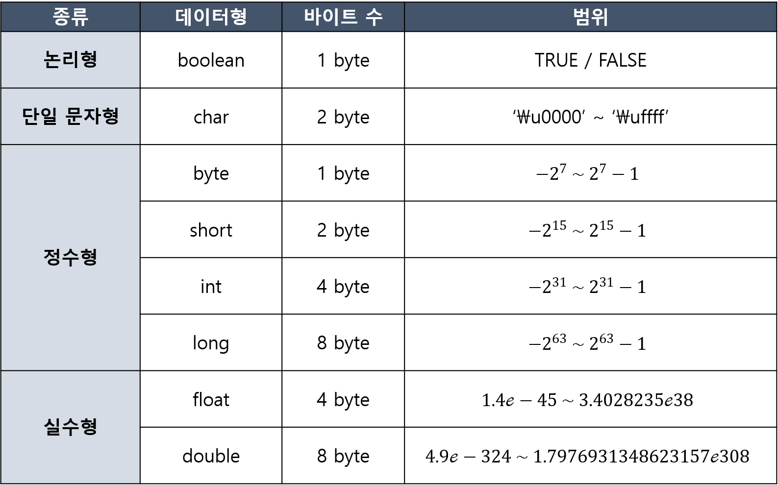 - 정수형 : 소수점이 없는 숫자를 표현하는 자료형. 크기에 따라 byte, short, int, long 이 있다.