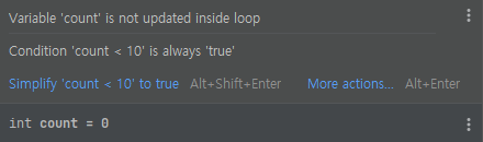 요즘 IDE 는 무한 루프에 빠질 경우 사전에 경고를 준다.