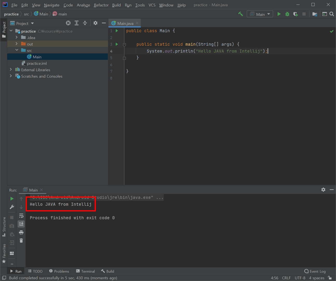 간단하게 Intellij 에서 JAVA 프로젝트를 실행할 수 있는 환경이 구축되었다.