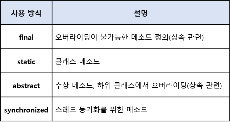 [접근 제어자] [사용 방식] 리턴타입 메소드이름([매개 변수]...) {