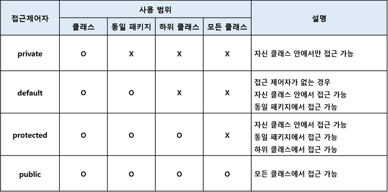 접근 제어자는 멤버 변수와 동일하게 적용된다.