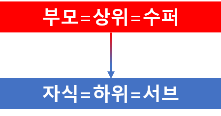 부모클래스는 상위클래스, 수퍼클래스라고도 불리고 자식클래스는 하위클래스, 서브클래스라고도 불린다.