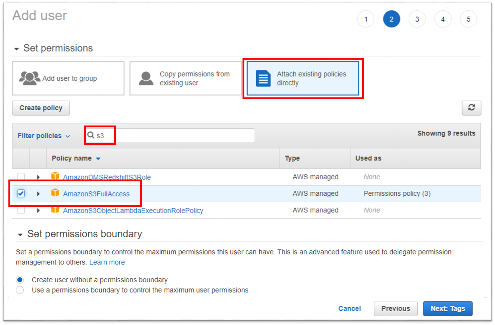 권한은 S3 를 검색하고 FullAccess 권한을 부여한다.