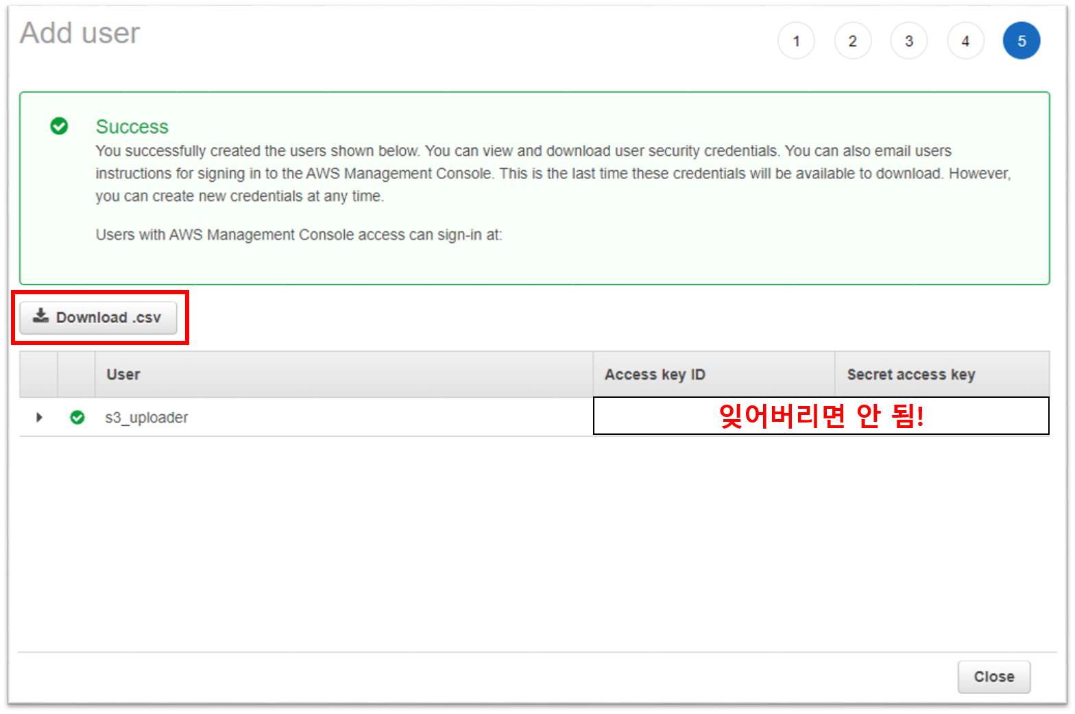 완료가 되면 Key 가 발급되는데 꼭 csv 를 다운로드해서 보관해야 한다. Secret Key 는 다시 안 알려준다..
